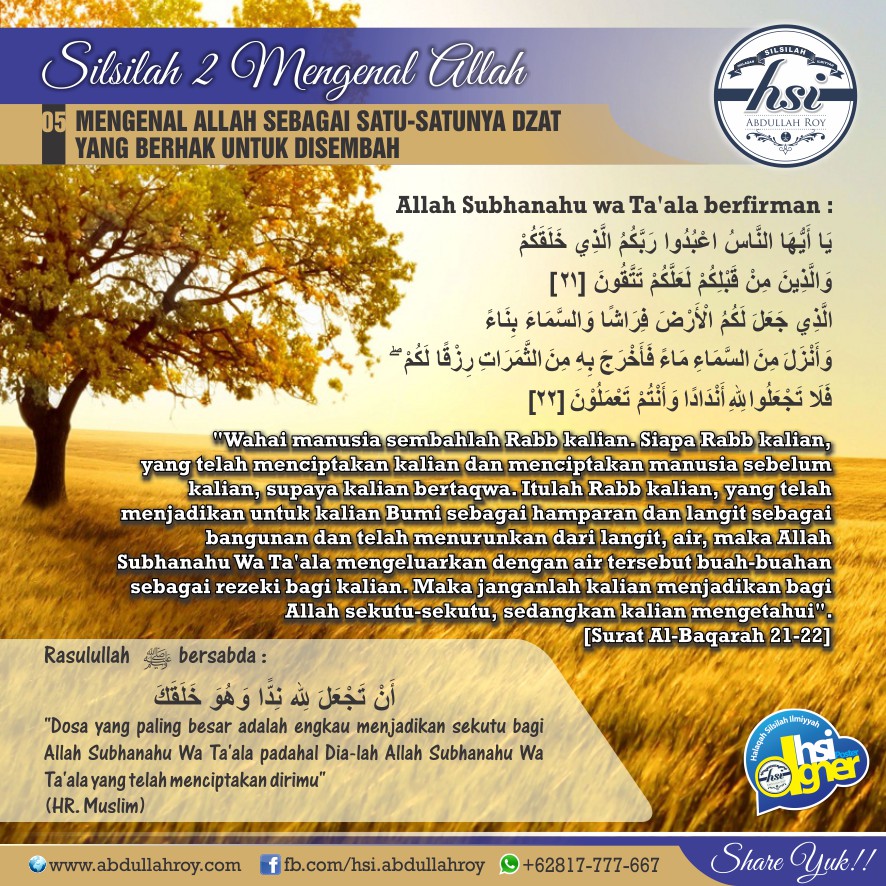 Halaqah yang ke-5 dari Silsilah Ilmiyah Mengenal Allāh ﷻ adalah tentang Mengenal Allāh ﷻ Sebagai Satu-satunya Dzat Yang Berhak Disembah.