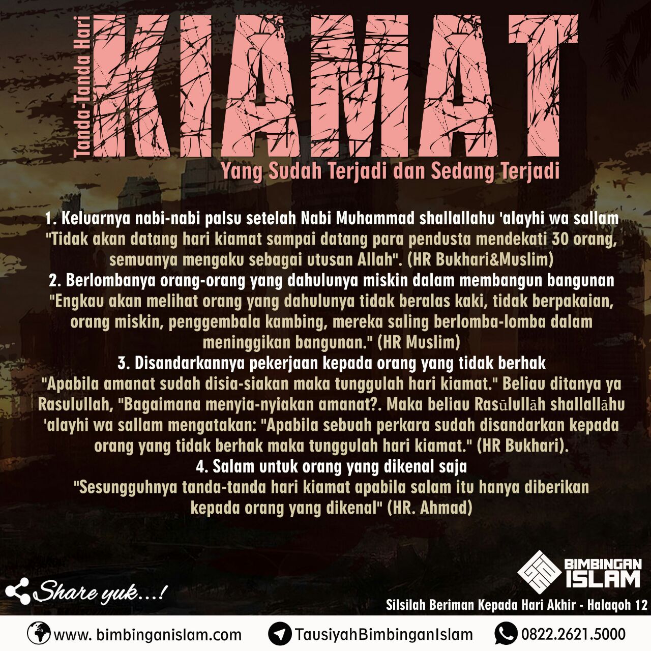Halaqah yang ke-12 dari Silsilah Beriman Kepada Hari Akhir adalah tentang “Tanda-tanda Hari Kiamat Yang Sudah Terjadi Dan Sedang Terjadi”